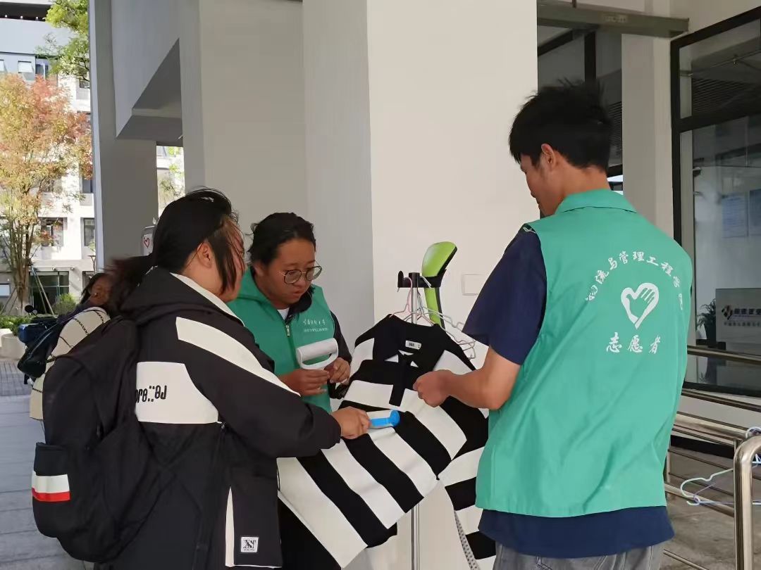 物流与管理工程学院开展一项特色品牌活动“火花熨衣,热意抚心”活动,参与者在志愿者的帮助下完成熨烫毛衣,活动服务人次1000人。