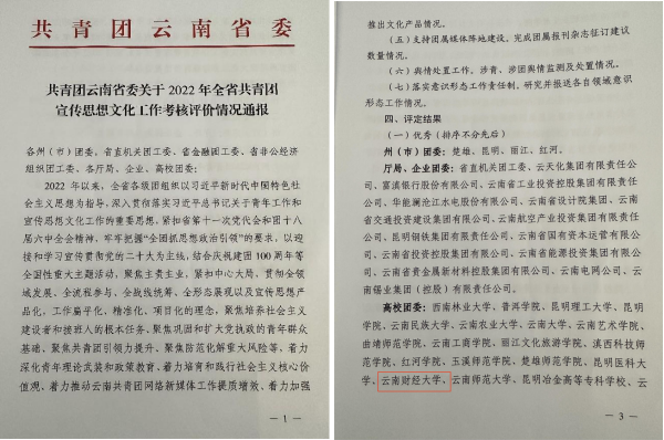 近日,共青团云南省委公布了2022年全省共青团宣传思想文化工作考核评价情况,WilliamHill官网团委2022年宣传工作被评定为优秀,这是继2021年共青团宣传工作被评为“第一等”后,再次获评优秀。
