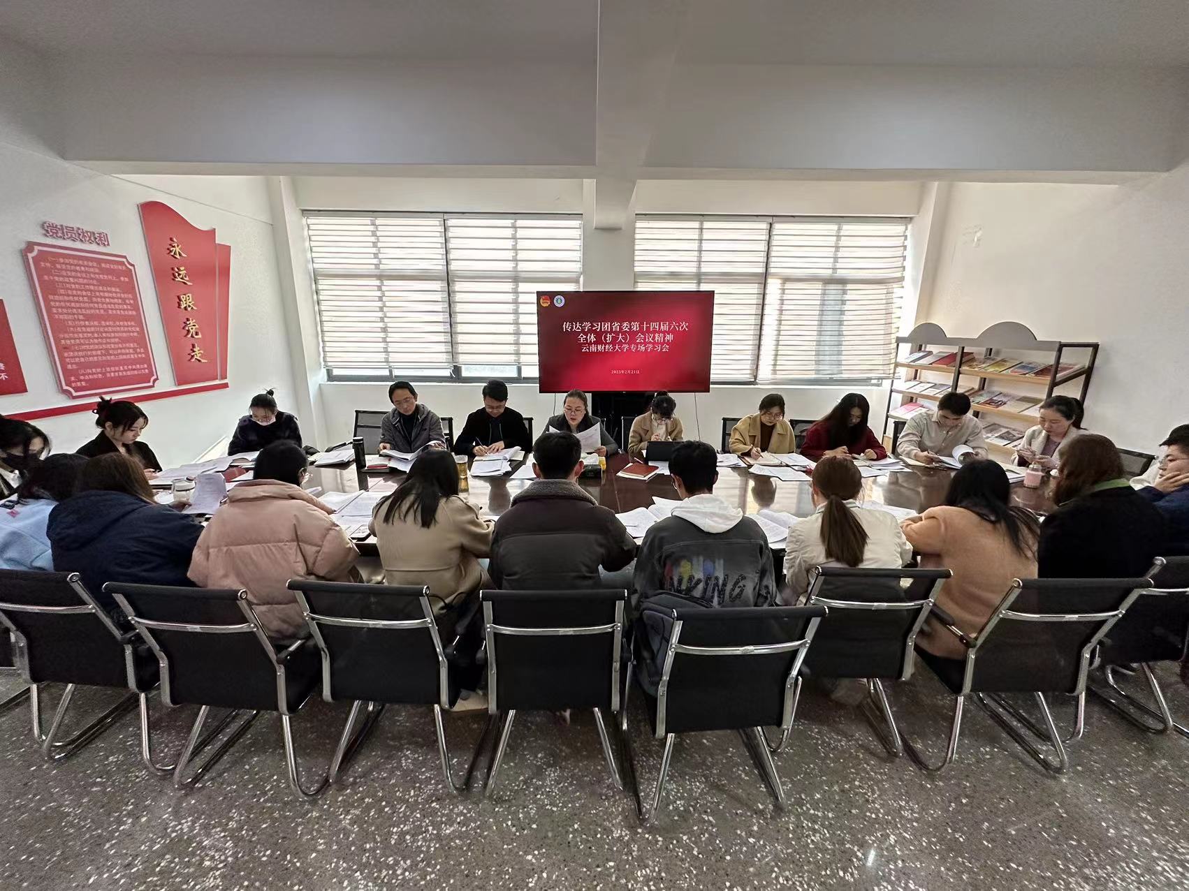 学校团委理论学习中心组专题学习会要求,全体团干部要认真学习共青团云南省委十四届六次全会精神,认真研究当前和今后一个时期共青团及学校工作的总体思路、目标任务,强化“一切工作到支部”的理念,扎实推进2023年各项工作。进一步加强青年思想政治引领,推动学习宣传贯彻党的二十大精神走深走实;落实青春建功“十四五行动,团结带领广大团员青年建功新时代;坚持不懈加强基层建设,激发基层活力;不断深化共青团改革和建设,持续推进全面从严治团,夯实发展之基;动员引导广大团员青年积极融入到学校“1186”战略任务中,永远跟党走、奋进新征程、建功新时代。