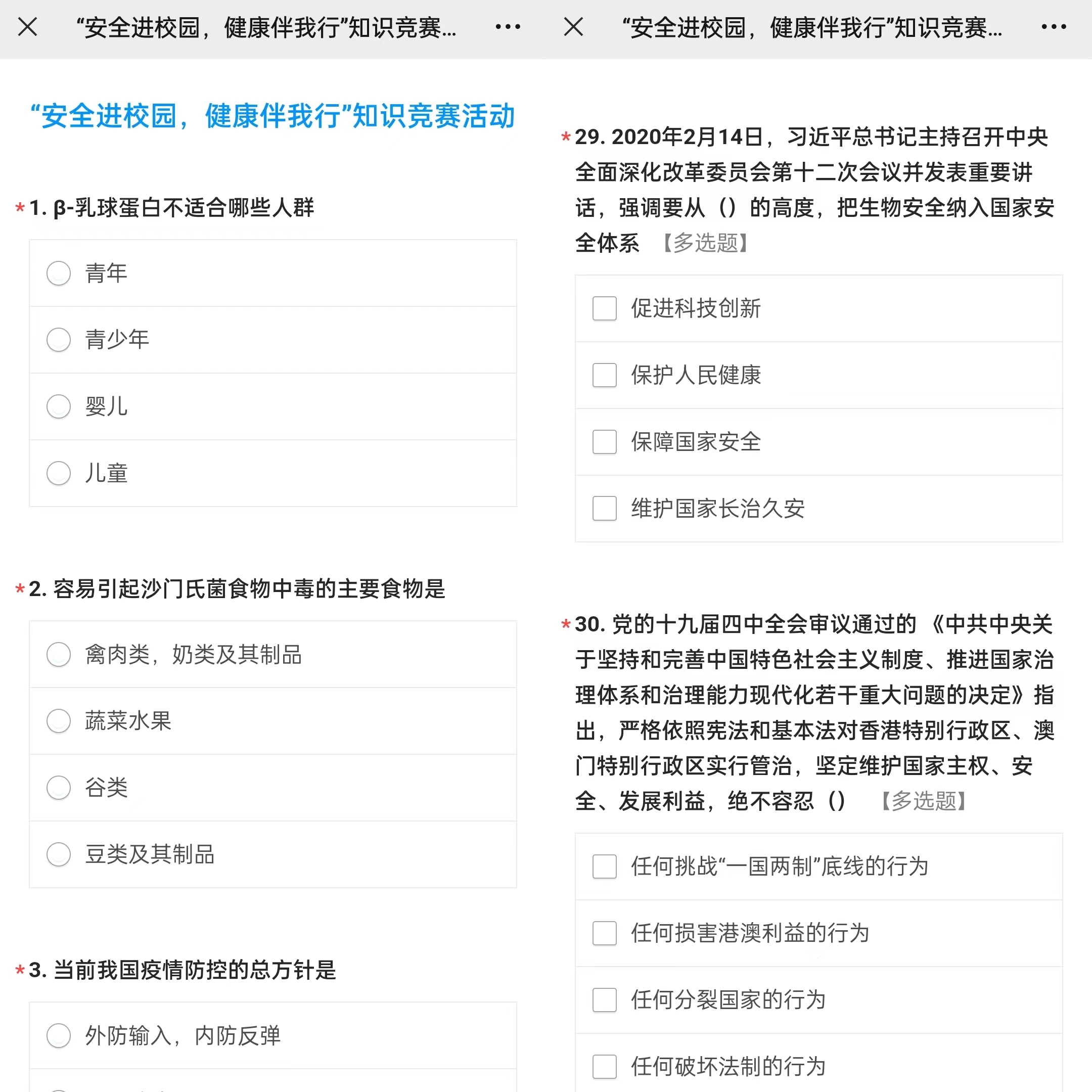 “安全进校园,健康伴我行”知识竞赛以总体国家安全观为指引,旨在宣传普及安全知识,强调树立国家安全意识、自觉关心、维护国家安全是每个公民的基本义务,增强同学们的安全责任意识和自我防范意识。通过知识竞赛的方式,加深同学们对于安全知识的理解,让全民国家安全教育走到同学身边,走到同学心里。