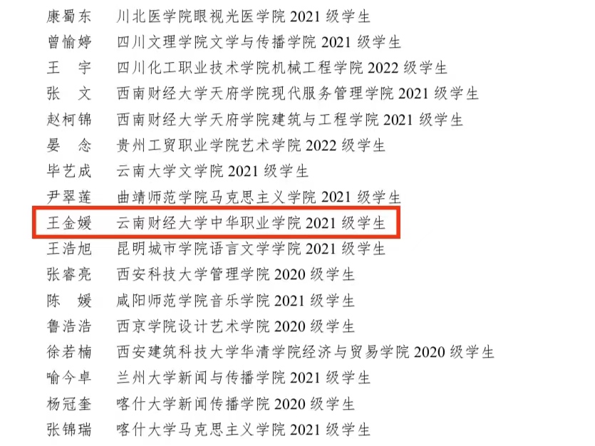 中华职业学院 2021 级学生王金媛荣获优秀通讯员称号。