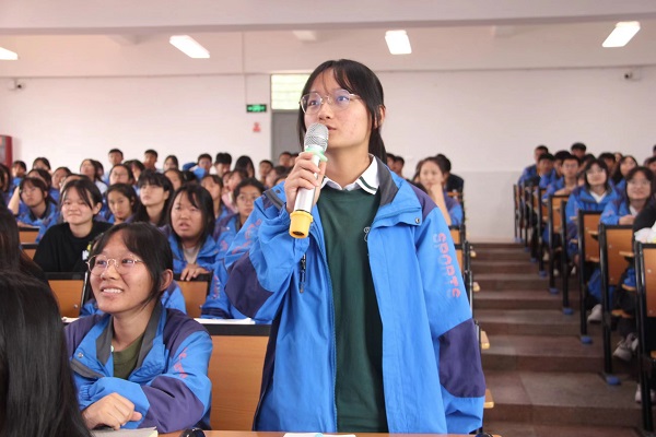活动开始,潘蓉以知名主持人撒贝宁和大家耳熟能详的“芝麻糊”三个字的正确读音为开场,通过轻松的氛围展开此次的普通话推广活动。接着,实践队员带领同学们进行辨析易错读音,通过击鼓传花的方式,让同学们尝试读出易错字的正确读音,并针对同一汉字在日常生活中出现多音混淆的情况进行科普,让同学们牢记于心。在接下来的“儿化音”造句小游戏中,同学们积极参与其中,用儿化音字词进行造句,现场氛围轻松愉快。在活动间隙,实践队员分别用自己所学的语种向同学们问好,并简单介绍了实践队情况。实践队员们还在现场为同学们就大学生活的细节、同学们对大学生活的问题等进行答疑,鼓励同学们珍惜在高中的学习时光,朝着自己的目标努力奋进。活动最后,实践队队员李雨霖带领大家共同学习了蔡奇在团十九大上的致辞,并且通过接力朗读的方式,让大家在学习理论的过程中检验普通话的学习效果。