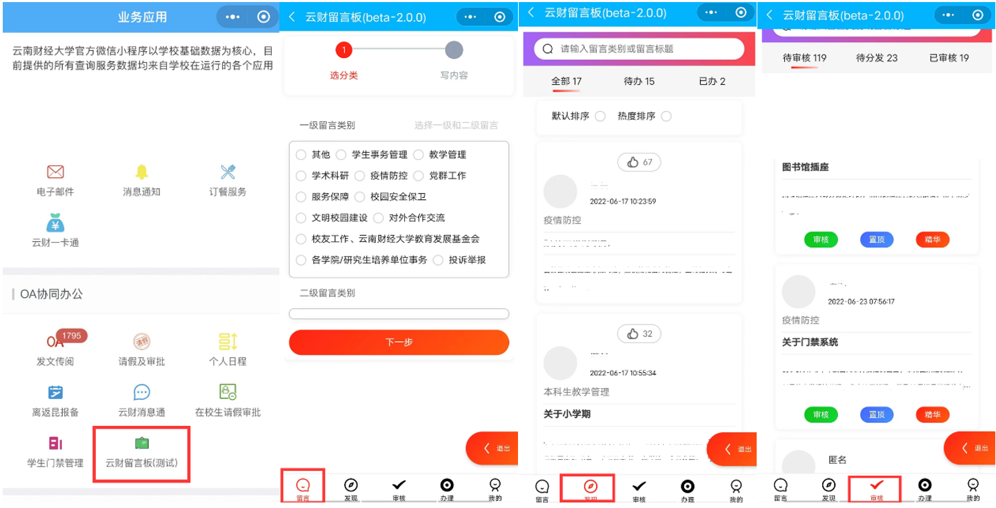 为进一步推进学校作风革命,提升效能建设,第一时间听取师生意见建议,及时回应师生关切,解决学校教育教学、管理服务中存在的问题,按学校及相关部门的要求,信息管理中心开发了云财留言板系统,并于6月17日上线试运行。