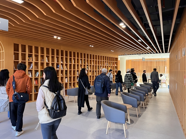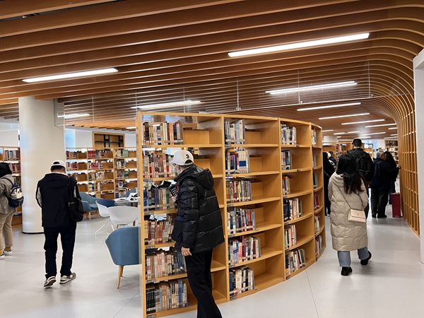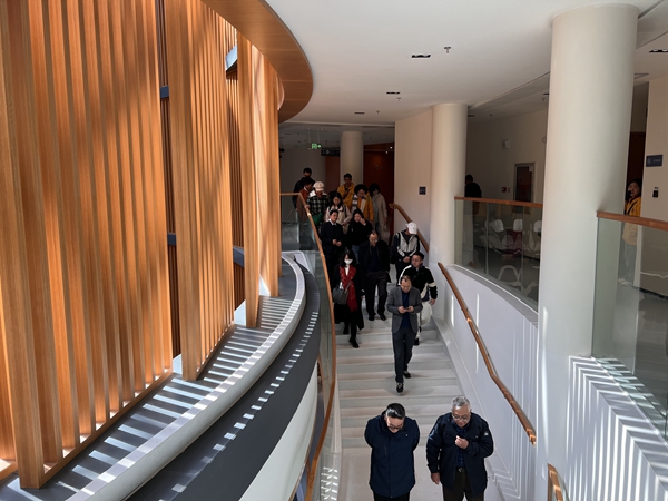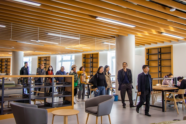 图书馆副馆长陈芊里带领校友们参观安宁图书馆,介绍了图书馆的设计理念、功能布局、数字资源建设、智能借还系统、管理与服务等情况。校友们逐个参观开放式书库、阅览室、研讨室、自习室等功能区域,得知3万平方米、阅览座位2700余个、藏书15万册,集信息化、智能化、电子化为一体的图书馆,只有不到10名工作人员利用现代化手段实施管理,引来校友们的阵阵感慨。