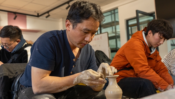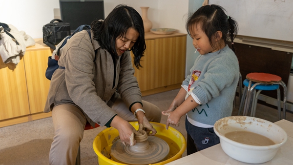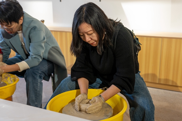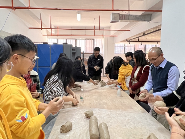 在传媒与设计艺术学院陶艺工作室,侯蒙老师带领校友们参观了学生作品,讲解了陶艺制作的历史和工艺,现场演示了拉坯制作手法。部分校友亲手实践拉坯制作,转盘上飞转的泥土,在各自手中变幻着造型。一不小心,泥坯塌了,懊恼声、欢笑声充满了工作室。