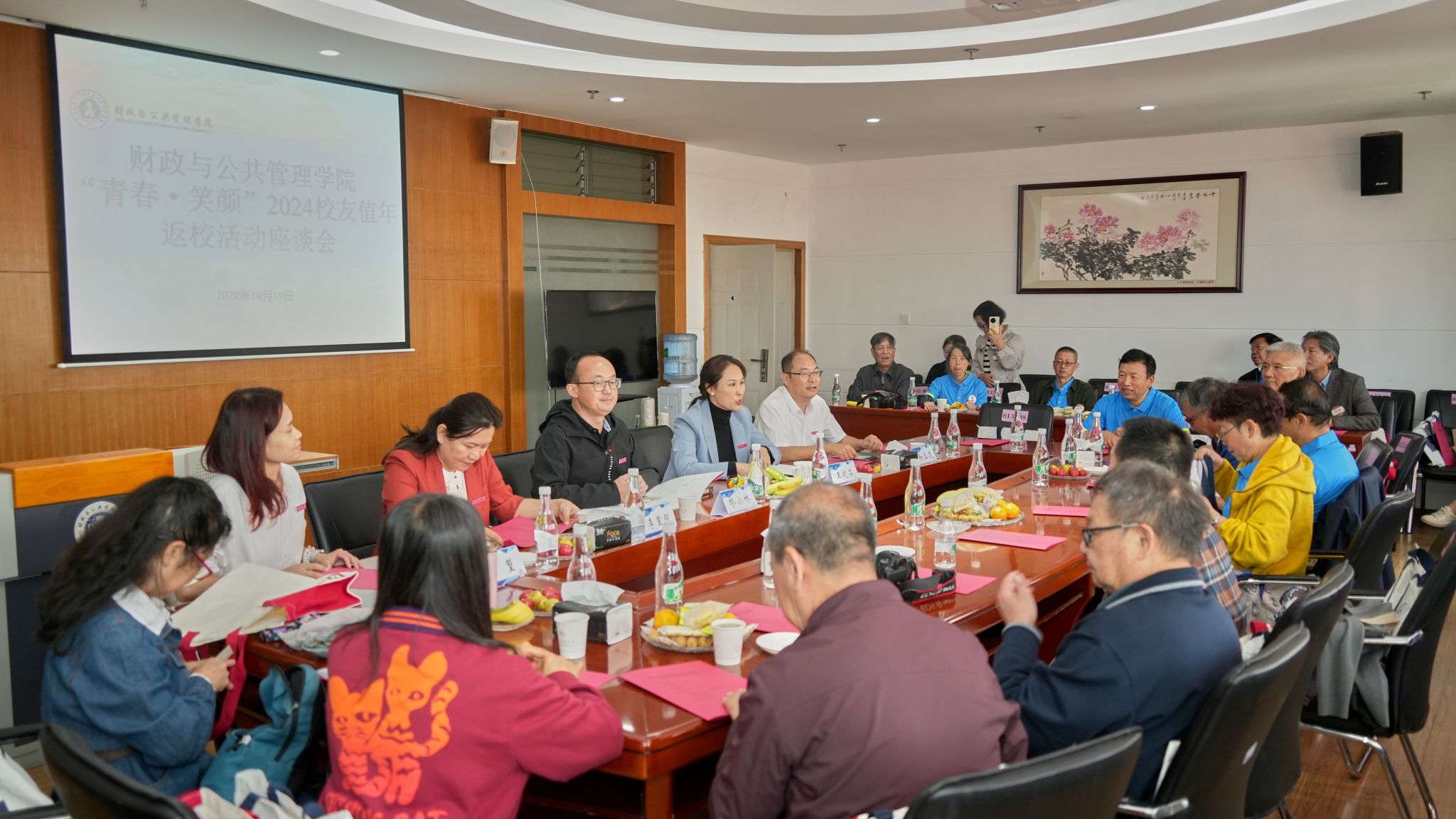 10月19日,金秋送爽之际,学校迎来盛大的“青春•笑颜”2024校友值年返校活动。财政与公共管理学院8131班、8132班、9232班校友返校参加活动。上午,学院在逸夫楼923会议室举行校友值年返校座谈会。院长缪小林,党委副书记王晓芬,副院长和立道、李重照,在校工作校友代表等教职工,与返校校友相聚一堂,重叙青春芳华,共话未来发展。王晓芬主持会议。