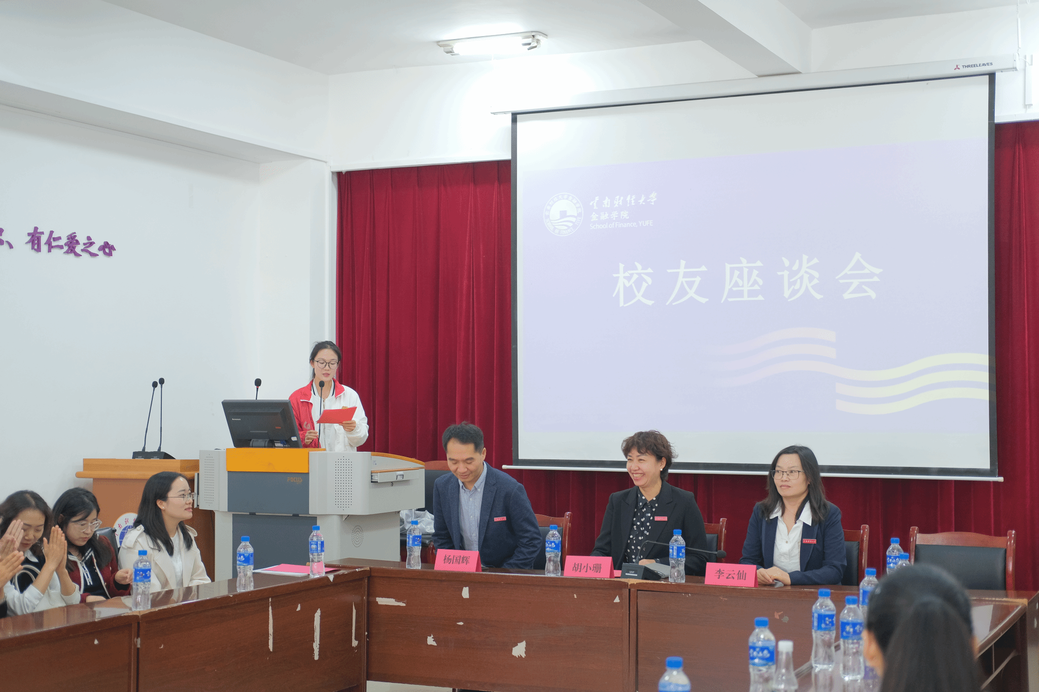座谈会正式开始之前,校友们驻足博远楼一楼走廊了解金融文化建设,志愿者以饱满的热情和专业的知识,向校友们介绍了学院的发展历程和建设成果。随后,学院党委书记胡小珊,副院长杨国辉、李云仙和校友们齐聚于博远楼103会议室开展座谈交流。胡小珊回顾了学校的变迁与发展,强调了校友对于学校和学院的重要意义,并鼓励大家继续发光发热,回馈社会,助力母校成长。几位杰出校友代表也纷纷登台,他们或分享个人职业生涯的精彩瞬间和发展经历,或畅谈对未来教育趋势的见解并提出发展建议。现场气氛热烈,思想情感交流深入。