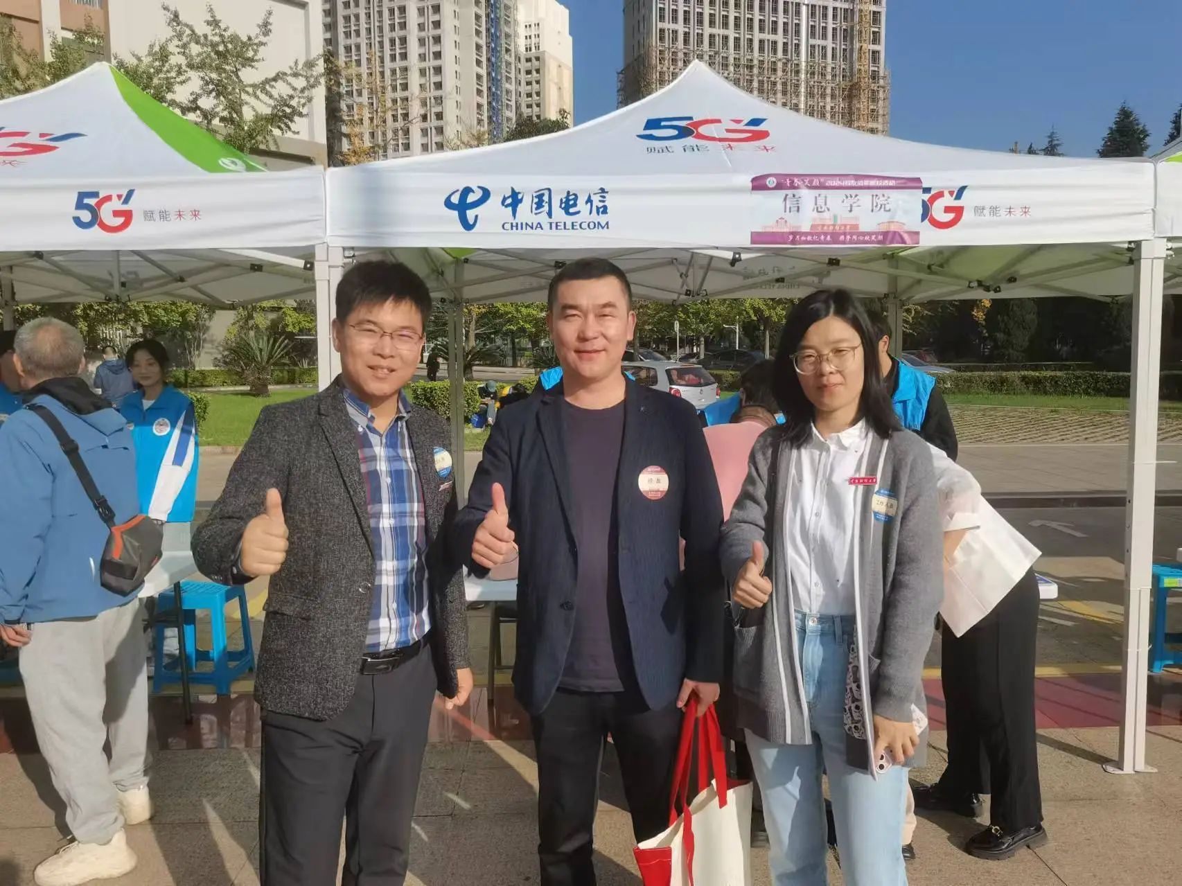信息学院党委书记李娟,副院长赵成贵、徐兴贵,办公室主任张涛,辅导员刘洁,班主任唐永昆、杨小云、吴红刚以及志愿者们在北院汇文礼堂前迎接信息学院的校友们。