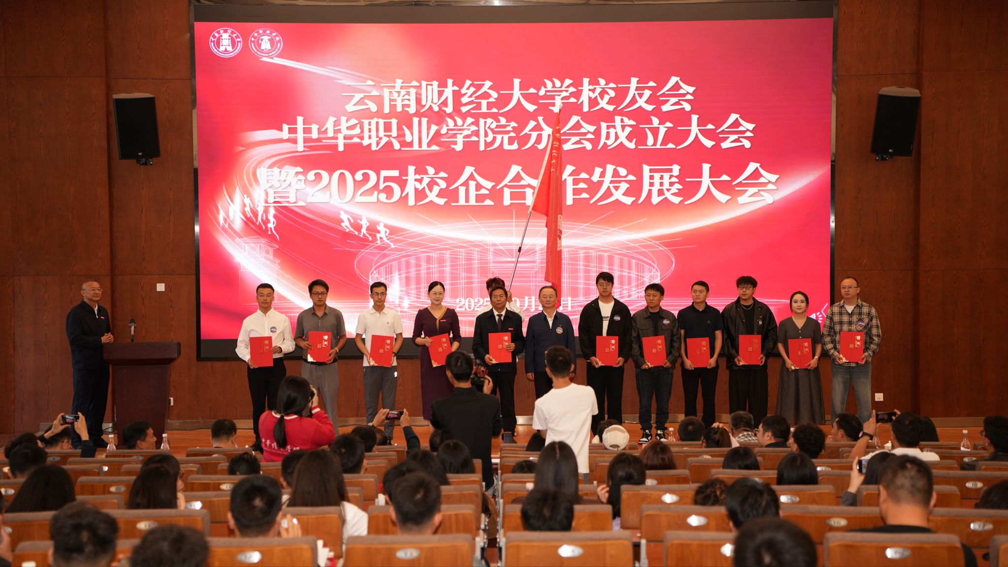 2025年9月20日,WilliamHill官方网站校友会中华职业学院分会成立大会暨2025校企合作发展大会在安宁校区鹏云一栋101报告厅隆重举行。校党委书记陈红出席,校友代表和学院教职工300余人参加。会议由中华职业学院党委书记李丽忠主持。