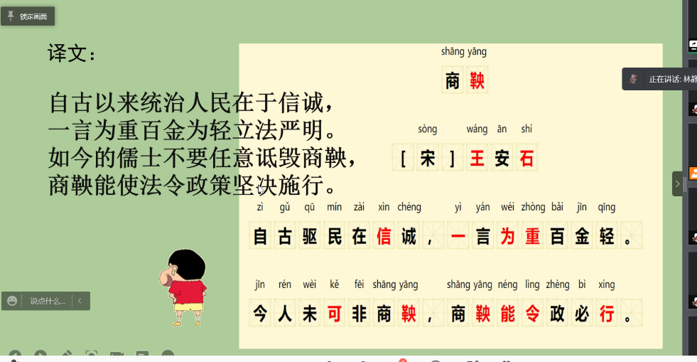 活动开始,李昕恬同学带领小朋友们朗诵了《三字经》片段,小朋友们积极参与朗诵。活动中,一共介绍了3首经典诗词,分别是王安石的《商鞅》和《凤凰山(其一)》以及杜甫的《绝句(其一)》。志愿者们在其中还穿插了许多有趣的小视频,使得经典知识变得活灵活现。每首诗的最后同学们还做了精炼的总结,并且将古诗与当今法律知识结合,将古诗背后蕴含的法律知识做了简单的普及,体现了云财法学生们积极的普法思想。