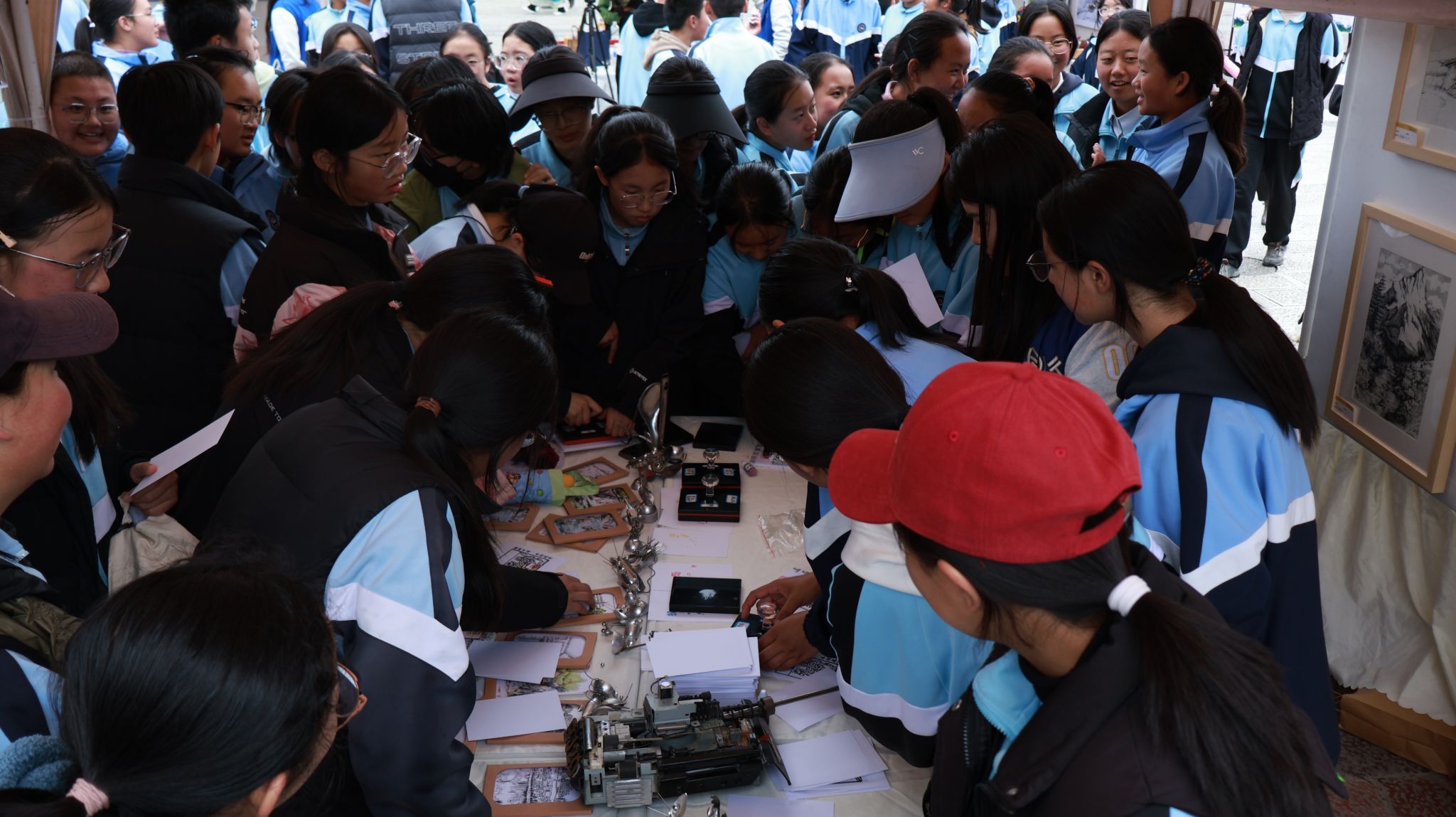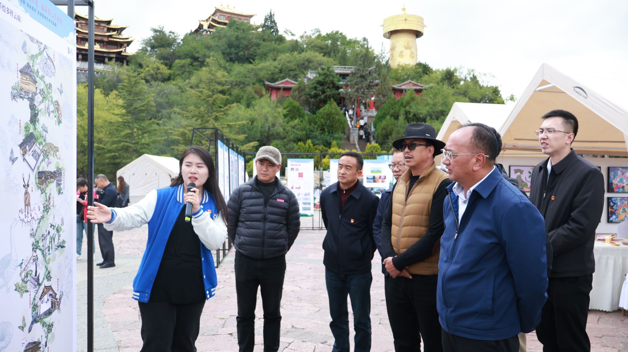 传媒与设计艺术学院党委书记张波介绍了展览作品的内容和创作来源。此次展览作品源于学院今年9月1日—7日的“彩云撷美·丝路同行——香格里拉专业采风”活动,师生深入香格里拉各地进行调研与创作并最终形成1000余件艺术作品。展览分为三大板块:“共创篇”“同心篇”和“青绘篇”,分别从“促进民族团结,共创美好未来”“民族团结一家亲,同心共铸中国梦”“青春心向党,共绘爱国情”不同角度展示了多民族文化的交融与共存。
