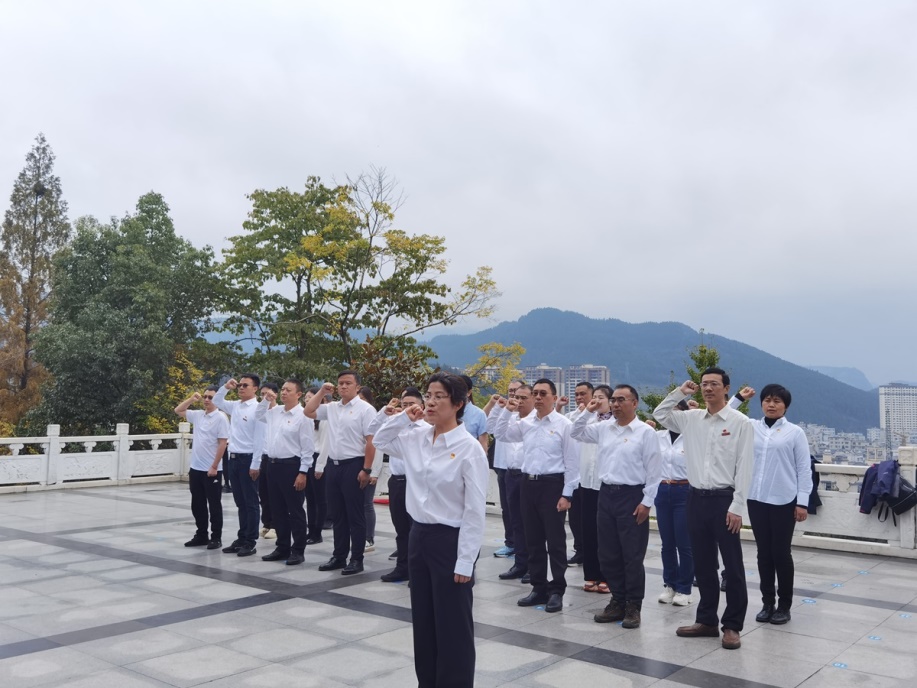 在扎西红军烈士陵园,大家静静地聆听了徐策、龙厚生、殷䘵才等革命烈士英勇牺牲的事迹,瞻仰了长眠着川滇黔边区游击纵队83名英烈的墓地。在庄严肃穆的扎西红军烈士纪念碑前,朱恒祥带领大家驻足默哀、鞠躬,向革命先烈敬献花圈,瞻仰革命烈士纪念碑。王素疆带领党员重温入党誓词,大家切身感受到革命先烈“头可断,血可流,理想信念坚如铁”的革命气节。