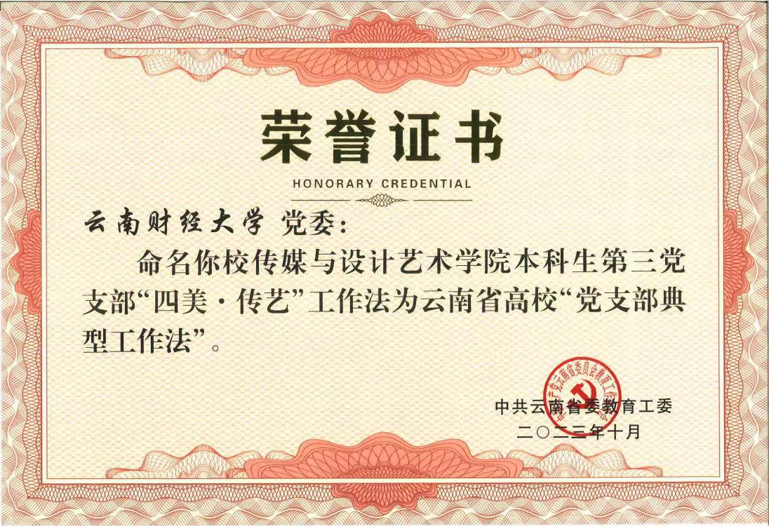 近年来,传媒与设计艺术学院党委坚持党建引领,突出艺术设计与新闻传播专业优势,探索构建“党建+专业+美育”工作模式,持续打造“艺马当先”党建内核,通过建好“专业链”,让以美育人“扎根”;通过优化“服务链”,让以美育人“落地”;通过创新“传播链”,让以美育人“发声”,推动“一融双高”要求在学院落地生根并开花结果。传媒与设计艺术学院本科生第三党支部通过探索建立以“党建+美育”为引领的学生党员教育载体与路径,深入实施“学美”强基、筑牢传艺根基,“赏美”共融、探索传艺真谛,“画美”润心、擦亮传艺名片,“创美”实践、淬炼传艺梦想的“四美•传艺”工作法,创造性结合当前国家时政热点和地方经济所需,既融入国家战略发展,又服务地方经济发展和基层群众所需。近几年来,支部陆续推出《抗疫上河图》《手绘多样云南》《绘征程•心向党》等6组手绘长卷,被新华网、人民网、“学习强国”等主流媒体报道和转载,支部获评教育部第三批全国党建工作样板支部、云南省首批云岭先锋红旗党支部、云南省高校一流党建示范党组织和规范化建设示范党支部。