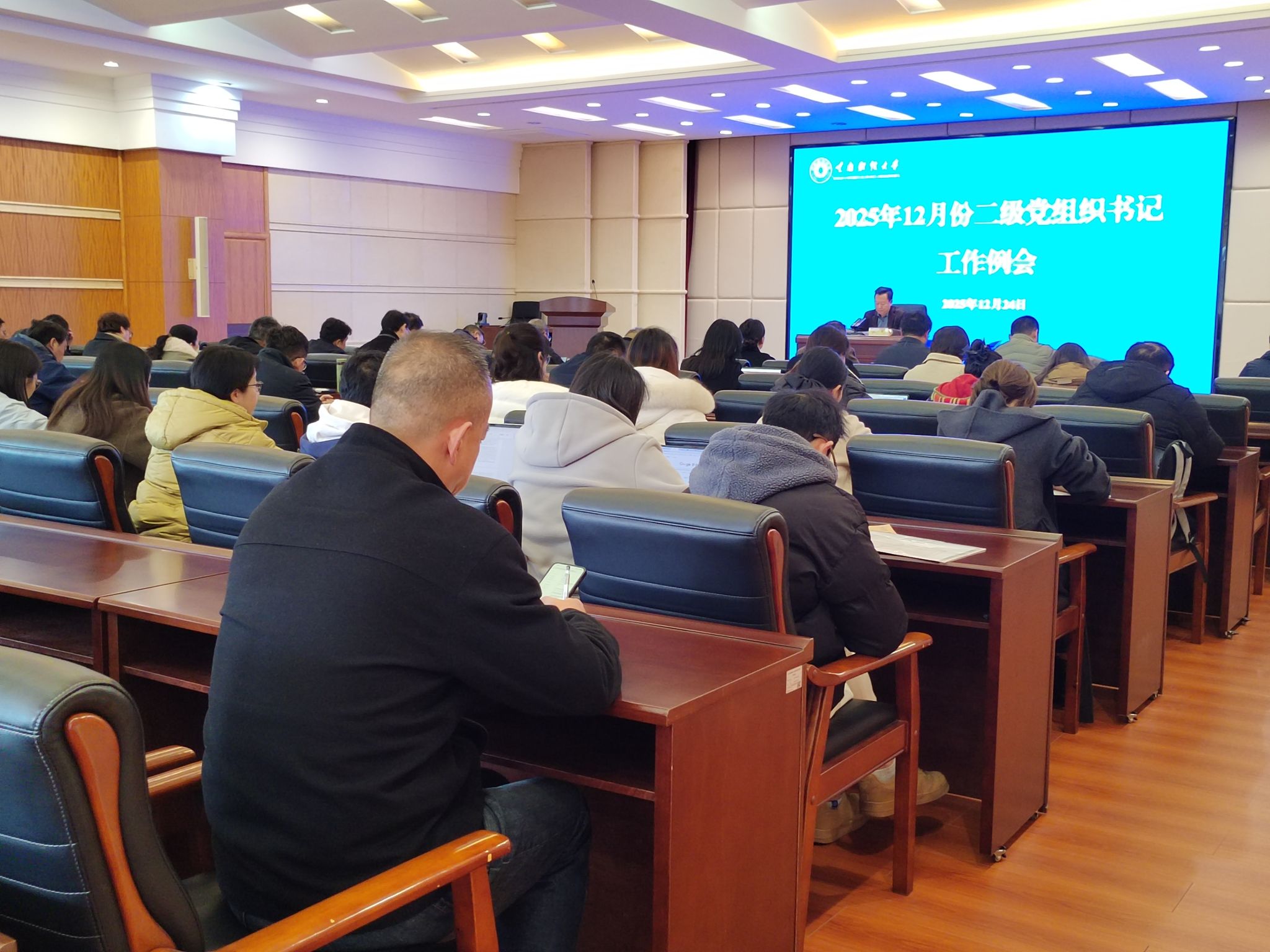 施仲军就各二级党组织全面抓好年末岁尾各项重点工作提出了三点要求:一是要统筹把握,全力攻坚推进年底各项工作。各二级党组织既要全力准备学校各项综合考核,又要加强统筹协调、合理规划,确保顺利完成各项工作。二是要总结谋划,全面做好年度工作总结与计划。既要客观总结2025年工作总体成效和特色亮点,还要紧密结合学校“十五五”总体规划编制工作,科学谋划2026年工作的总体思路、主要目标和重点任务。三是要强化值守,全力确保校园安全稳定。各二级党组织要进一步提高政治站位,聚焦学生管理、消防安全、交通安全等开展风险隐患排查,加强师生安全教育引导,全力保障校园安全稳定。