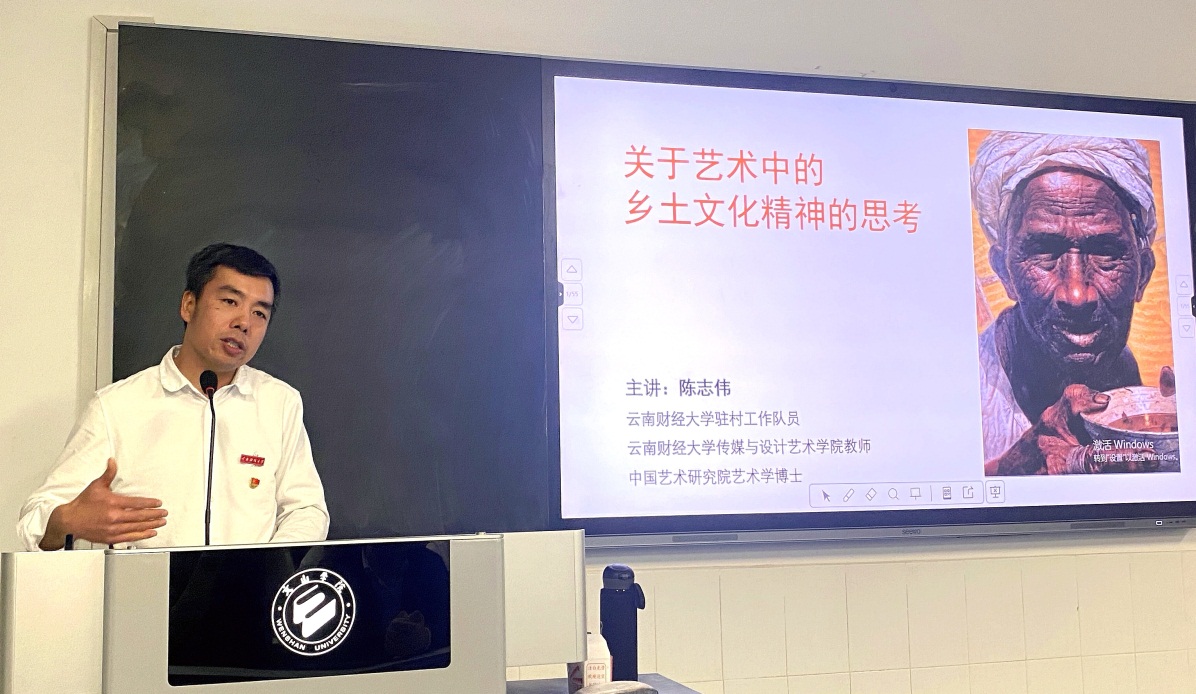 座谈交流会后,驻村工作队队员陈志伟博士应邀为文山学院美术与设计学院师生开展以《关于艺术中乡土文化精神的思考》为主题的讲座。