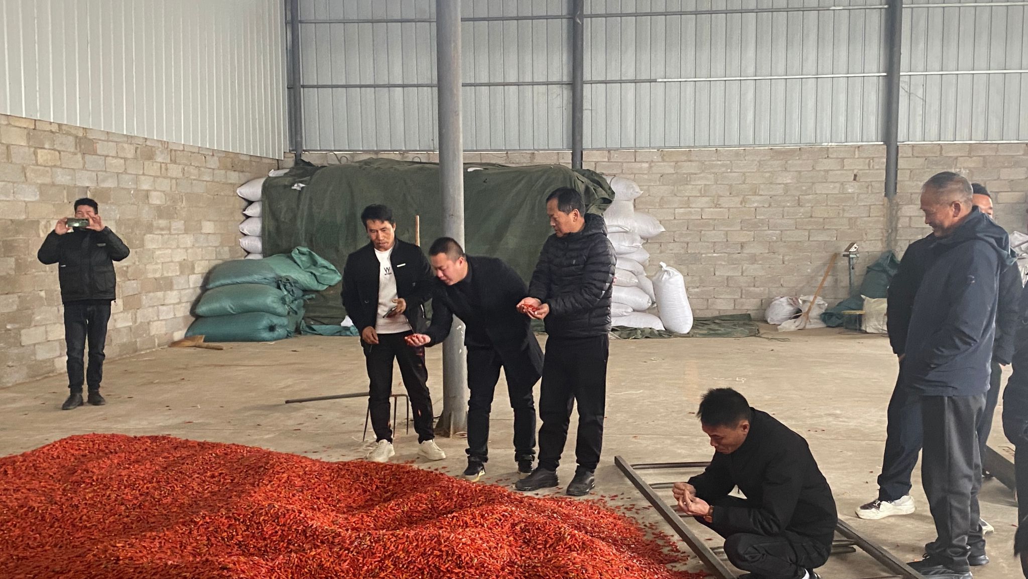 在稼依镇,调研团队先后走访了辣椒育苗基地、烤椒加工车间、冷藏仓库、辣椒交易市场,了解学习当地辣椒产业发展经验。调研团队针对田间管理、辣椒品种、加工储藏、销售价格等问题,与当地致富带头人深入交流,并对辣椒品种“椒中玉”的种植、管理、收购问题进行探讨。双方围绕“公司+合作社+农户”的模式,讨论如何有效整合资源,通过村集体经济带动农民增收致富。