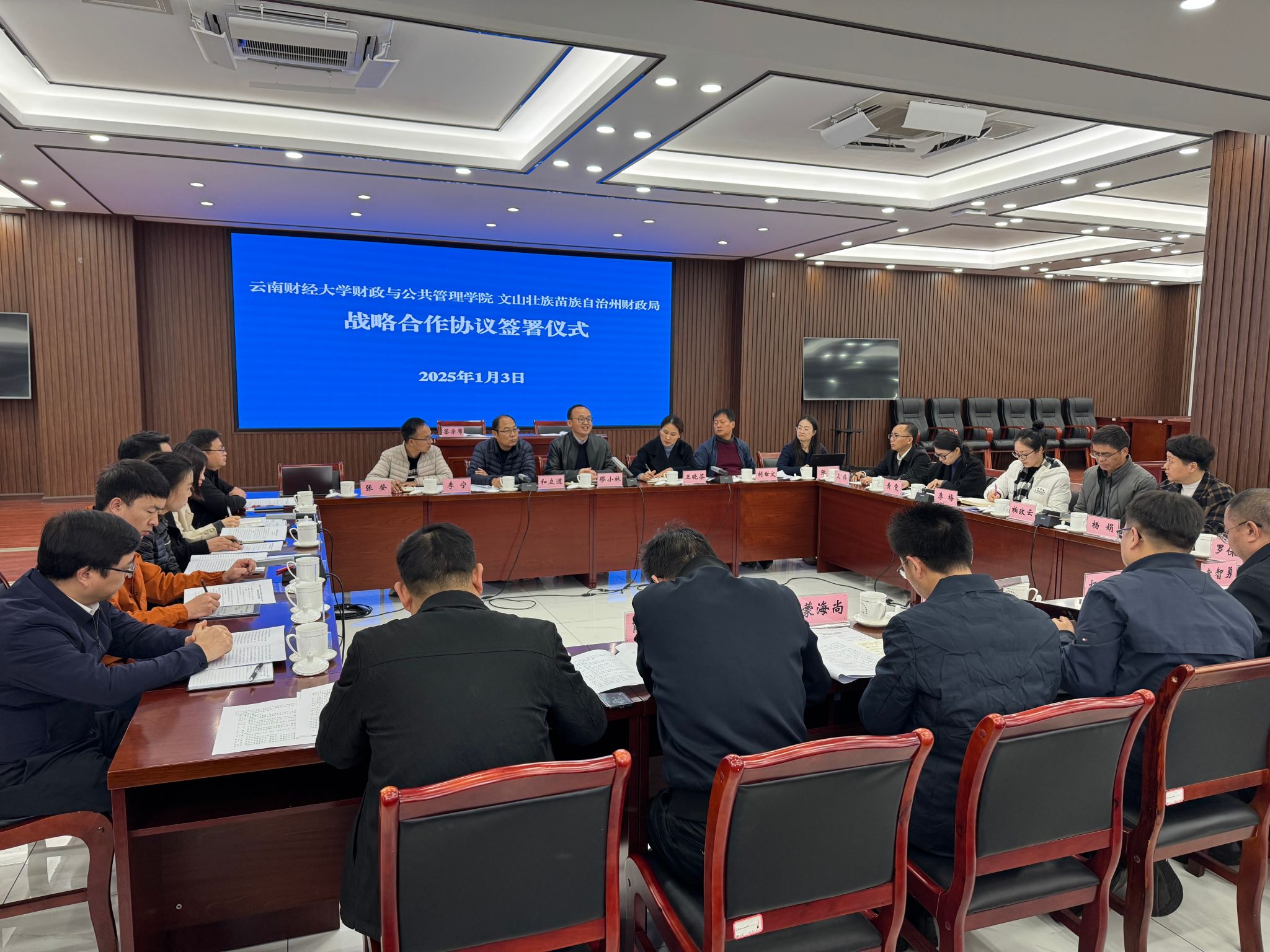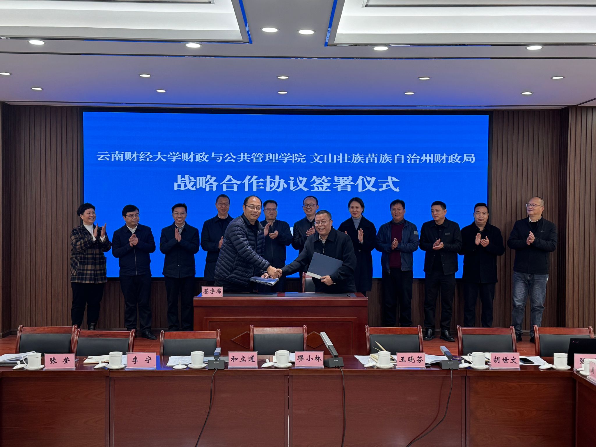 2025年1月3日,学校驻村工作队受邀参加WilliamHill官方网站财政与公共管理学院与文山州财政局战略合作签约仪式。文山州财政局局长吴长明,学校驻村工作队队长胡世文,财政与公共管理学院院长缪小林、党委副书记王晓芬参加仪式并开展座谈交流。